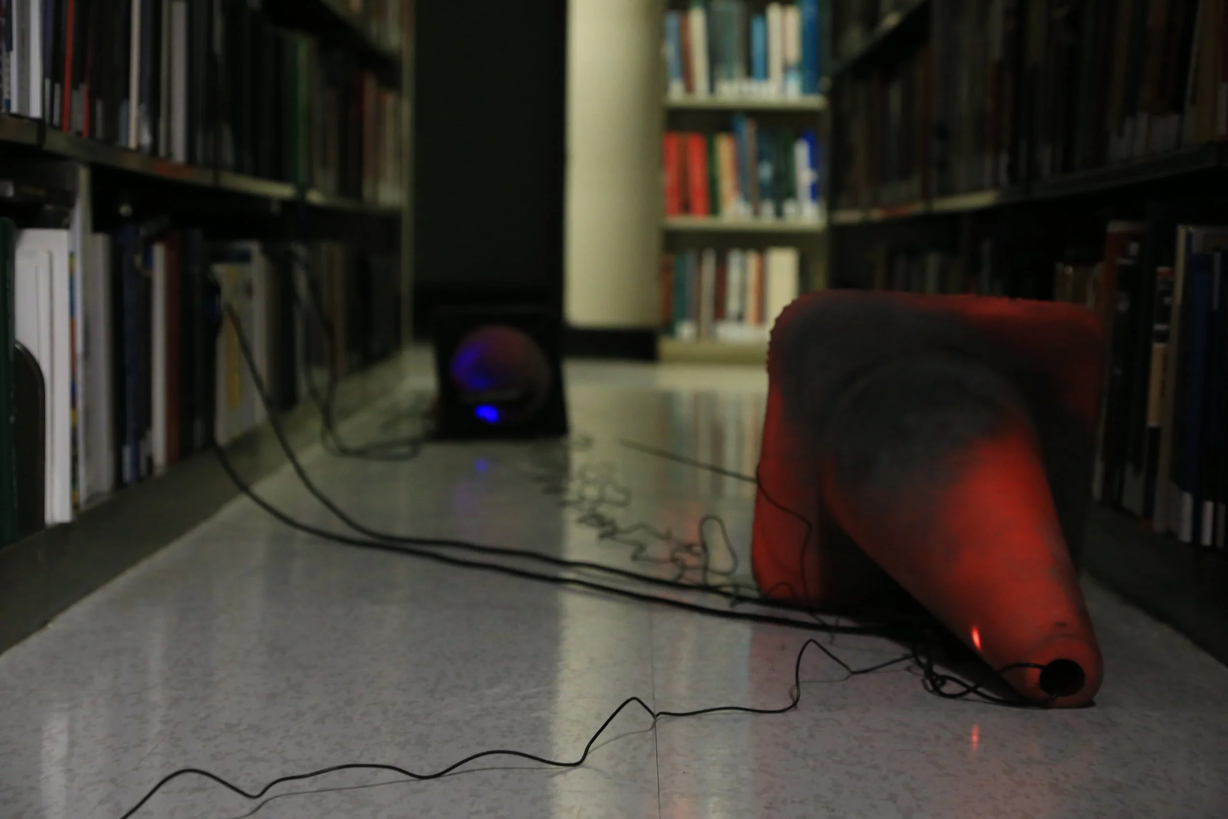 Sound acts as a vagrant body capable of defining space or place, it itself a vessel for memory. Though an uncontainable, non-visible phenomena, when embraced by a space, may delineate and specify place. Sound functions as the metaphysical scaffolding to bridge notions of space and time between visible media. As the photograph depicts, the sculpture embodies, and sound beckons.